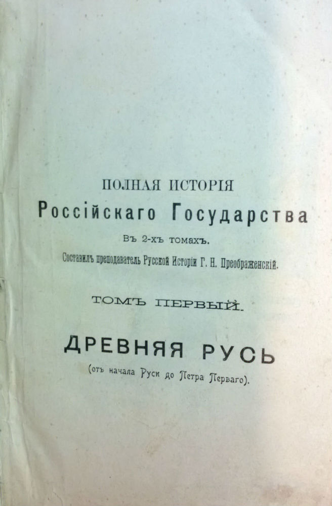Преображенский, Г.Н. : Полная история Российского государства въ 2-хъ томахъ. Томъ 1. Древняя русъ (от начала Руси до Петра Перваго) – История и военная история / Historia ja militaria