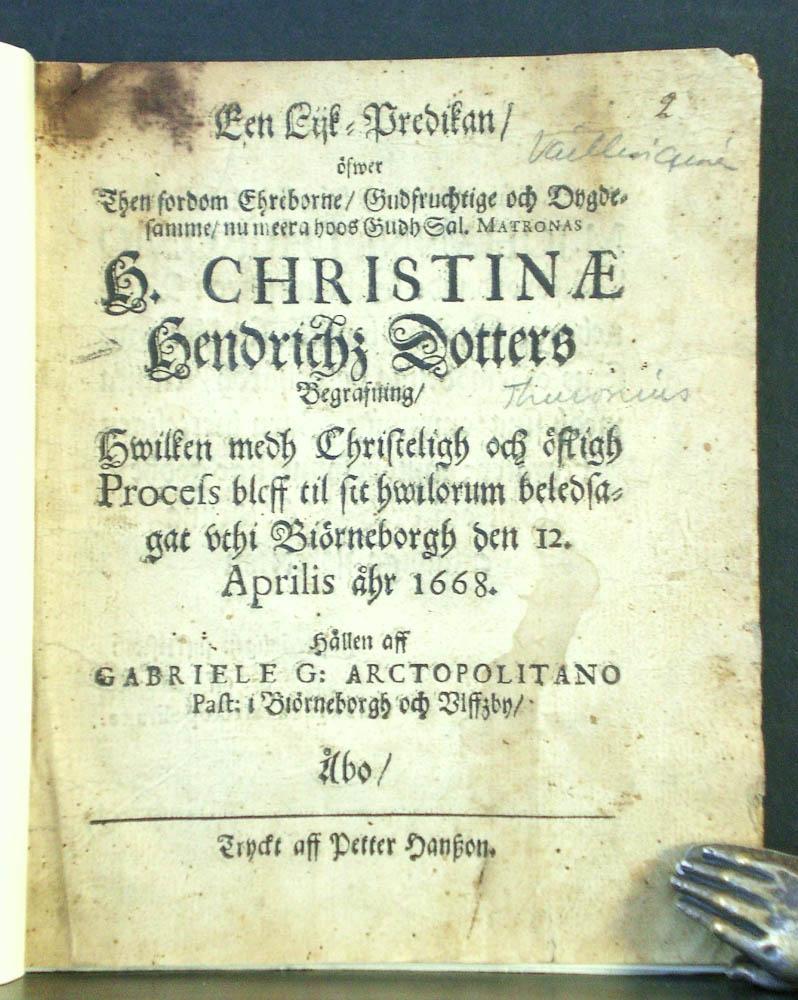 Een lijk-predikan, öfwer : matronas h. Christinae Hendrichz dotters begrafning, hwilken … bleff til sit hwilorum beledsagat vthi Biörneborgh den 12. aprilis åhr 1668. Hållen aff Gabriele G. Arctopolitano past: i Biörneborgh och Vlffzby