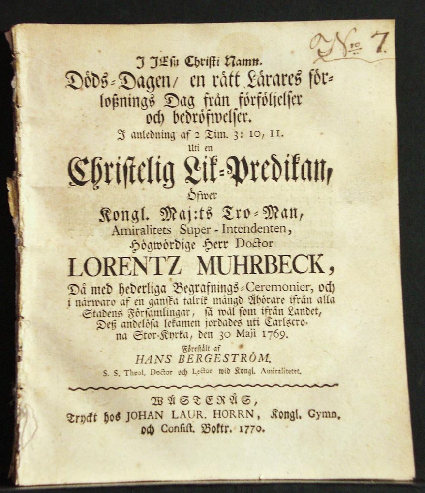 I Jesu Christi namn. Döds-dagen, en rätt Lärares förlossnings Dag från förföljelser och bedröwelser. I anledning af 2 tim. 3: 10, II. Uti en Christelig Lik-predikan, öfwer Kongl. Maj:ts Tro-Man, Amiralitetets Super-Intendenten, högwördige herr Doctor Lorentz Muhrbeck, Då med hederliga Begrafnings-Ceremonier, och i närwaro af en ganska talrik mängd Åhörare