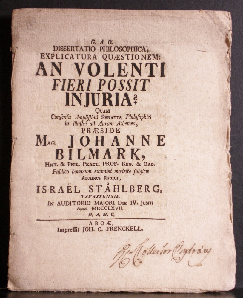 Bilmark, Johannes: Dissertatio philosophica, explicatura quaestionem: an volenti fieri possit injuria ? Resp. Israel Ståhlberg – väitöskirjat