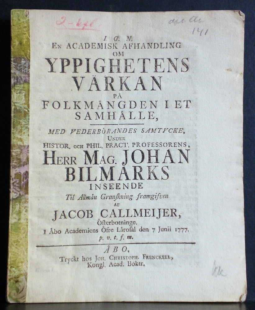 Bilmark, Johannes: En academisk afhandling om yppighetens värkan pÃ¥ folkmängden i et samhälle. Resp. Jacob Callmeijer – väitöskirjat