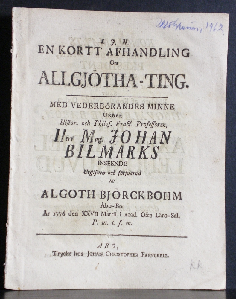 Bilmark, Johannes: En kortt afhandling om allgjötha-ting. Resp. Algoth Björckbohm – väitöskirjat