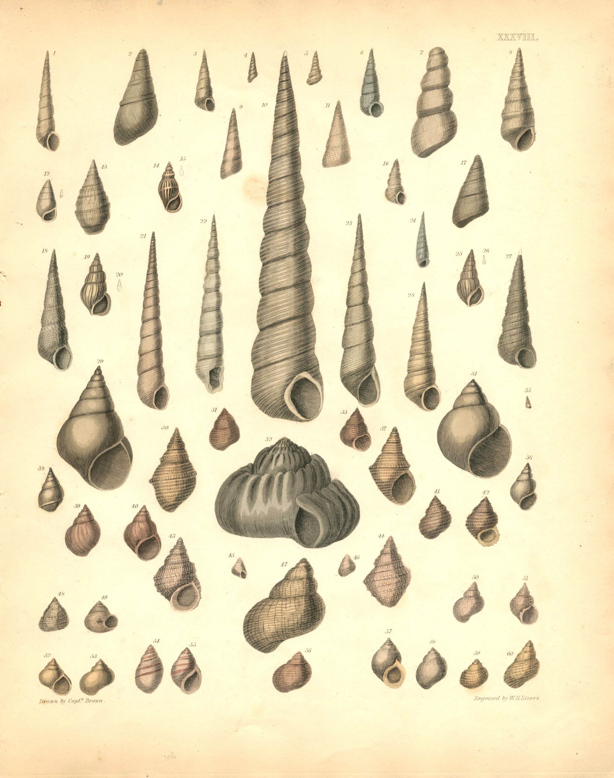Captain Thomas Brown (1785 – 1862) was a Scottish naturalist and illustrator. Following a military career, he dedicated himself to natural history, with a particular focus on conchology. These shell and fossil engravings are from the first edition of ‘Illustrations of the Fossil Conchology of Great Britain and Ireland’ published in 1849.