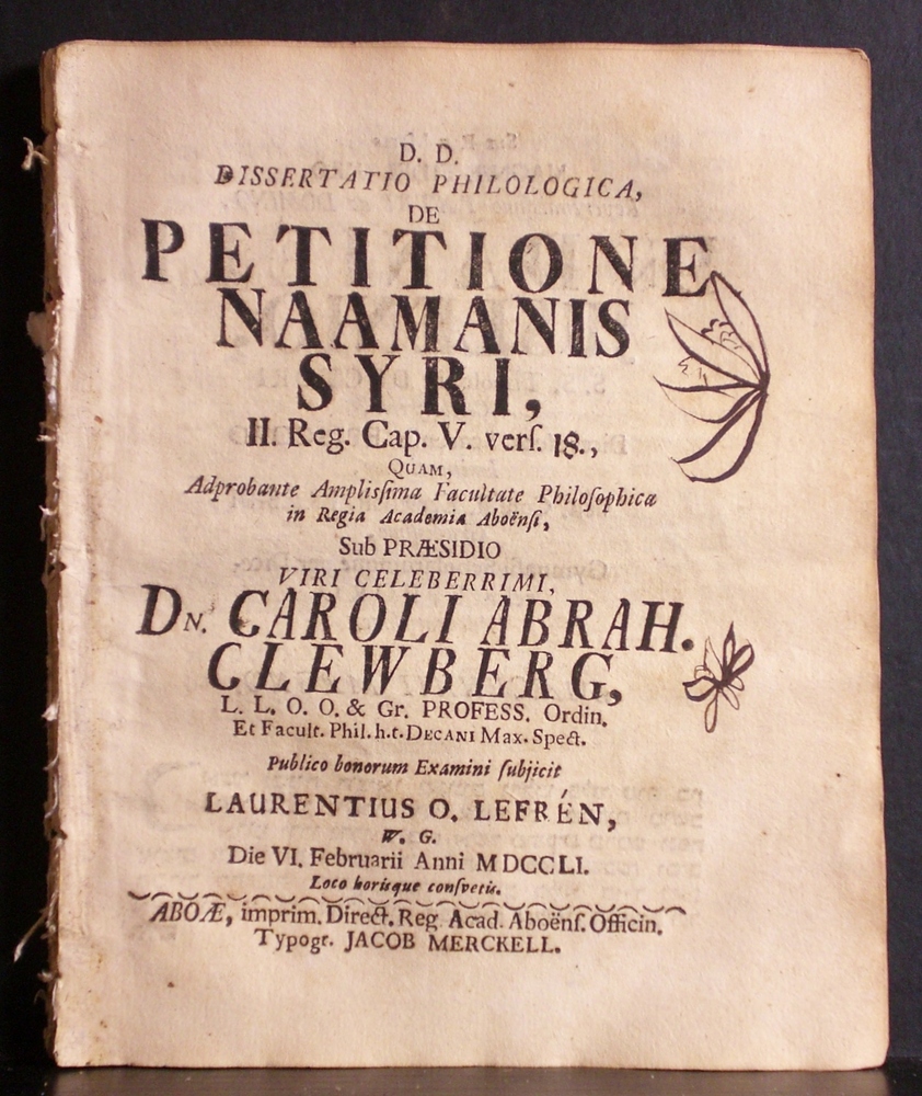 Clewberg, Carolus Abrahamus: Dissertatio philologica, de petitione Naamanis Syri II. Reg. cap. V. vers 18. Resp. Laurentius O(lavi) Lefrén – väitöskirjat