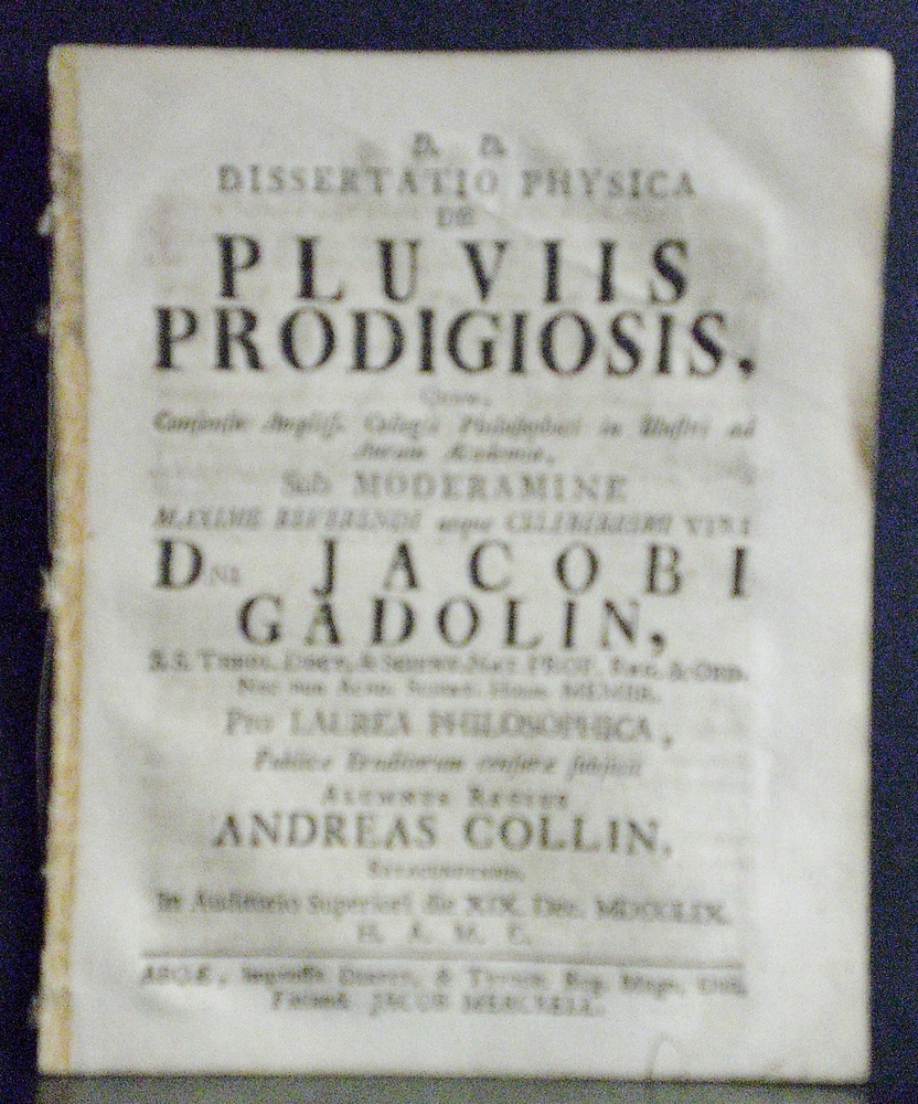 Gadolin, Jacobus: Dissertatio physica de pluviis prodigiosis. Resp. Andreas Collin – väitöskirjat