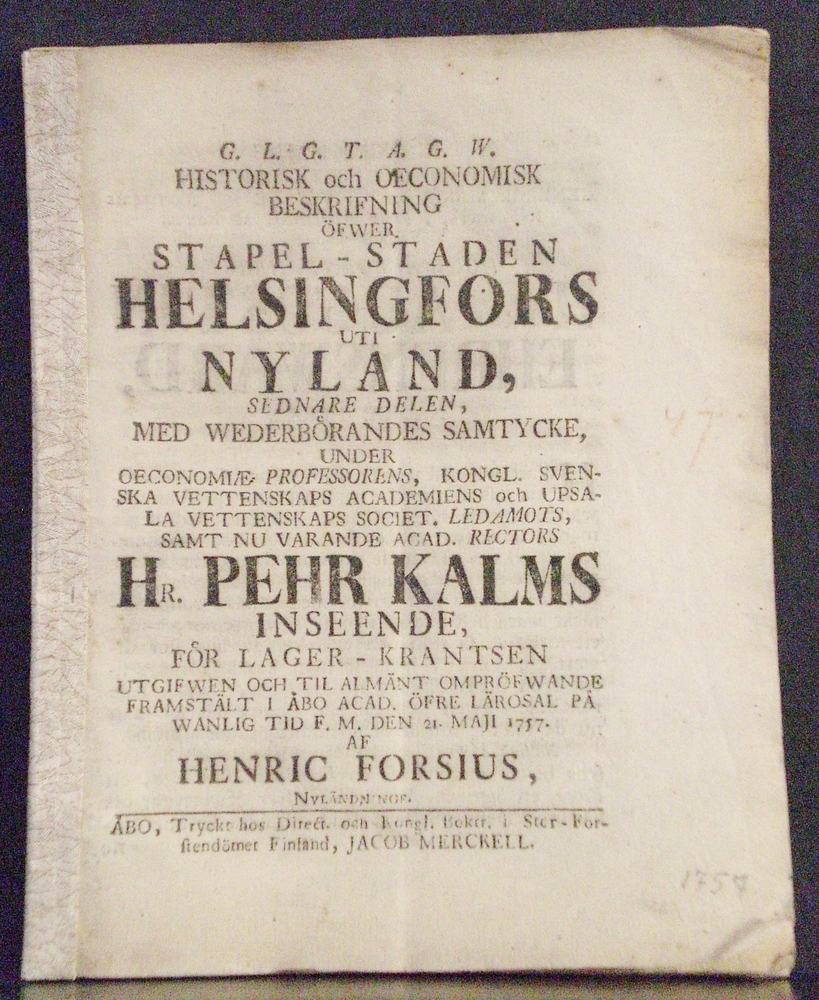 Helsinki – Helsingfors. Kalm, Pehr: Historisk och oeconomisk beskrifning öfwer stapel-staden Helsingfors uti Nyland, sednare delen. Resp. Henric Forsius – kaupungit