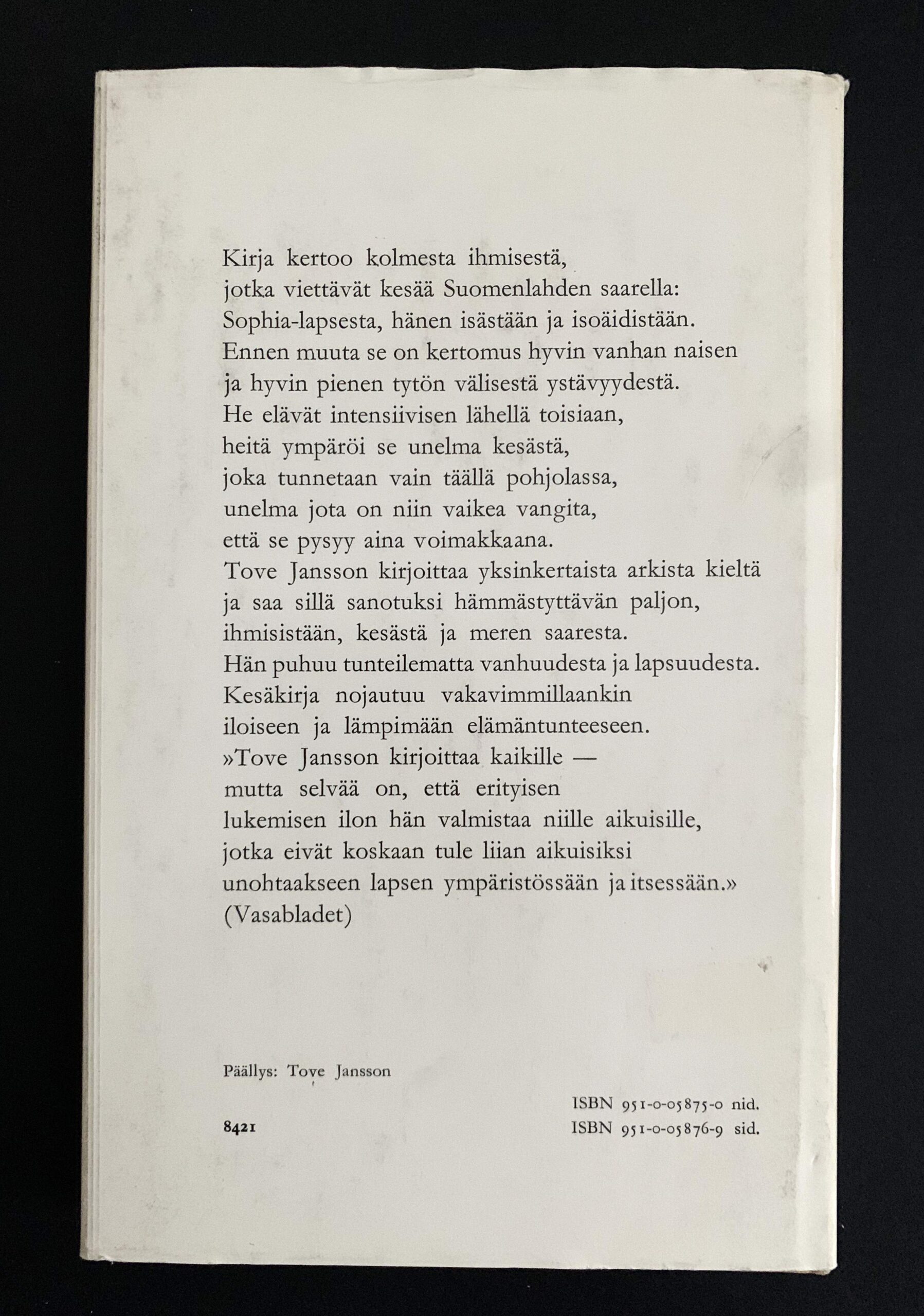 Suomenkielinen ensipainos Tove Janssonin Kesäkirjasta. Painettu Porvoossa WSOY:n kustantamana 1973. 143 sivua. Sidottu, kansipaperi. Kansipaperissa yksi pieni repeämä. Muutoin siisti kappale. Napakka sidos ja puhtaat sisäsivut.