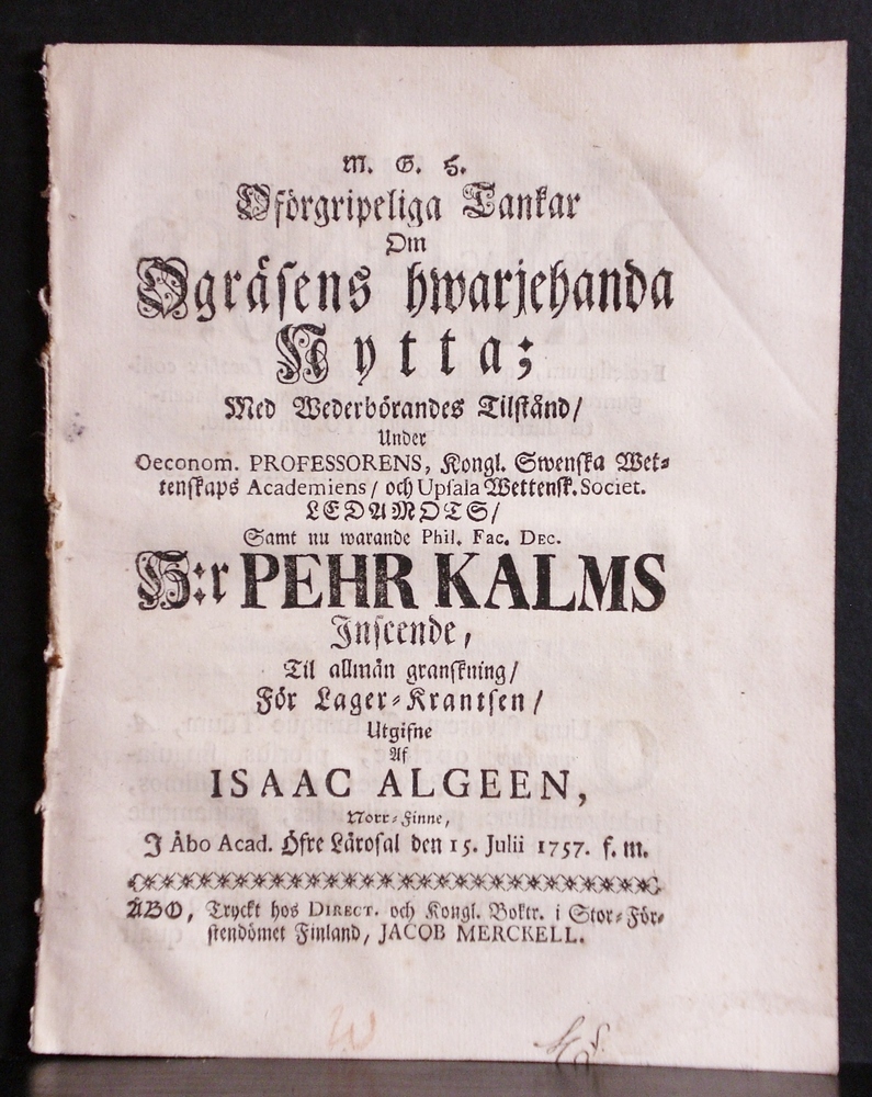 Oförgripeliga tankar om ogräsens hwarjehanda nytta; med wederbörandes tilstånd, under oeconom. professorens, Kongl. Swenska Wettenskaps Academiens, och Upsala Wettensk. Societ. ledamots, samt nu warande phil. fac. dec. h:r Pehr Kalms inseende, til allmän granskning, för lager-krantsen, utgifne af Isaac Algeen, norr-finne, i Åbo Acad. öfre lärosal den 15. Julii 1757. f.