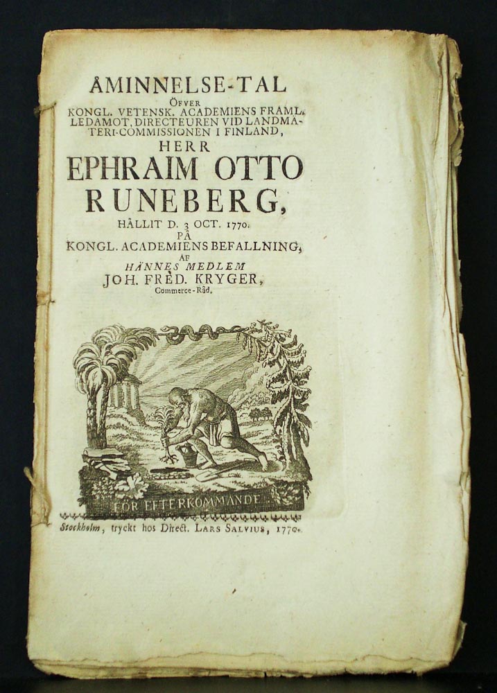 Kryger, Joh. Fred.: Åminnelse-tal öfver Kongl. Vetensk. Academiens framl. ledamot, directeuren vid Landsmäteri-commissionen i Finland, herr Ephraim Otto Runeberg, hållit d. 3 oct. 1770
