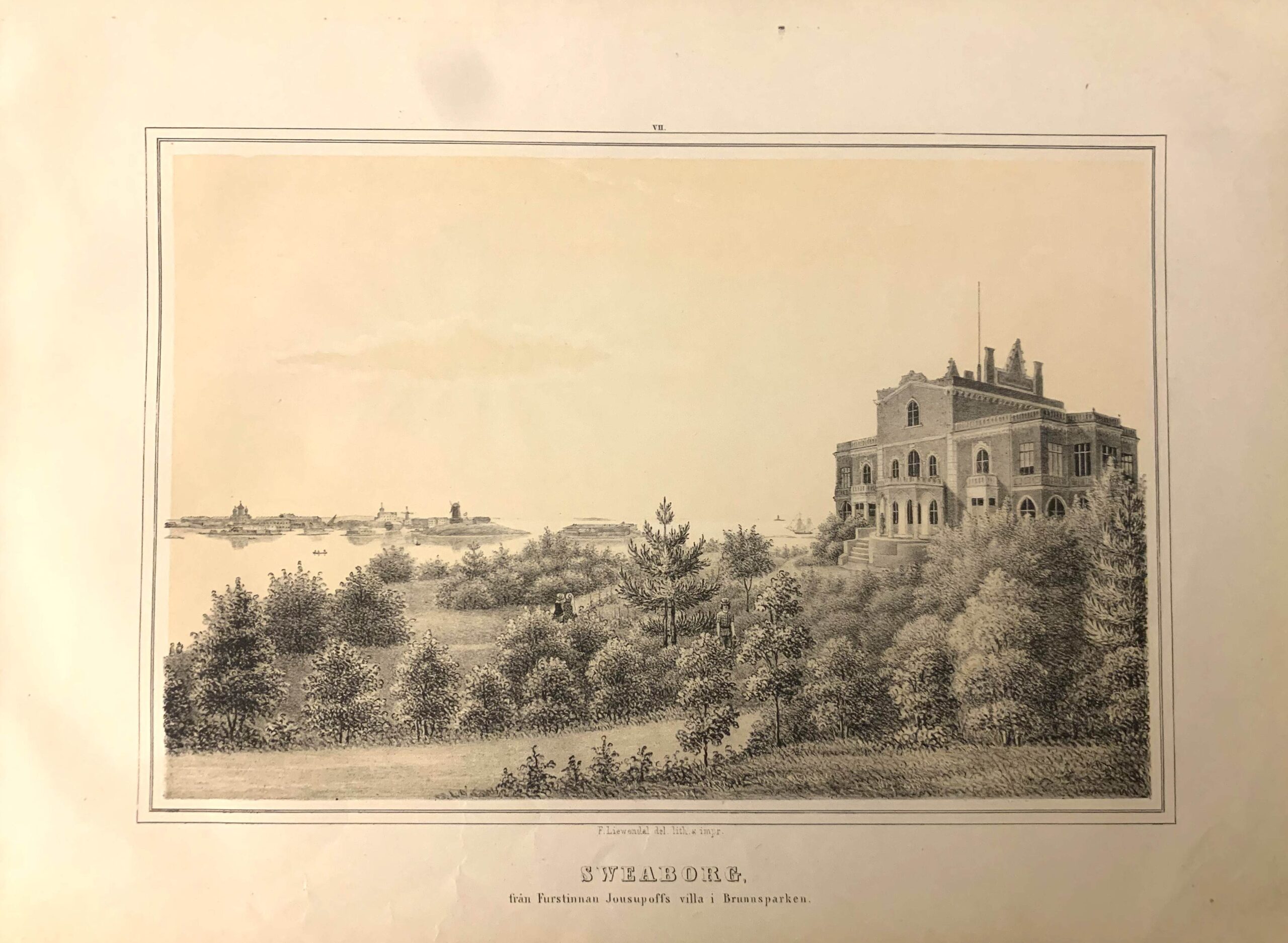 F. Liewendalin piirtämä ja painama kivipiirros Suomenlinnasta ja ruhtinatar Jusupovin huvilasta Helsingin Kaivopuistossa.