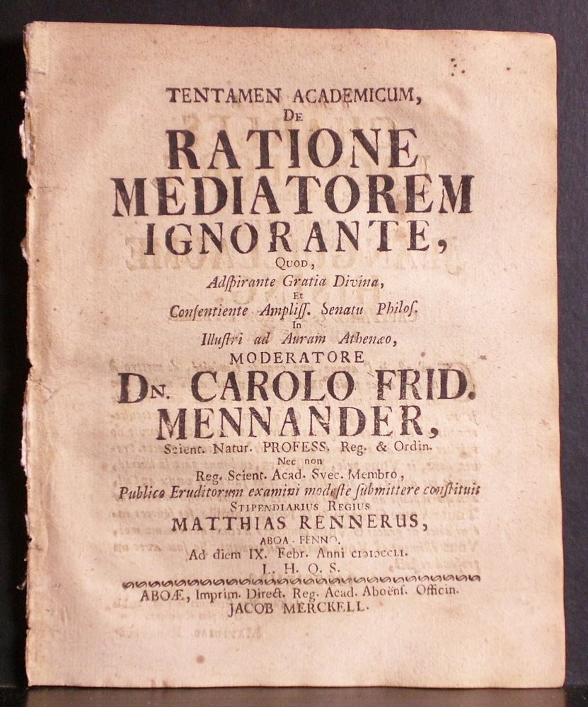 Mennander, Carolus Fridericus: Tentamen academicum, de ratione mediatorem ignorante. Resp. Matthias Rennerus – väitöskirjat
