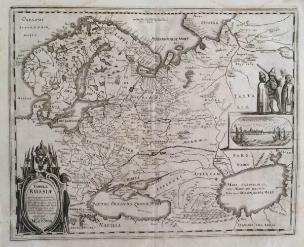 17th century engraving showing western parts of Russia and most of Skandinavia. Small bird-eye view on Archangel. Based on Hessel Gerritsz map of Russia from 1613.