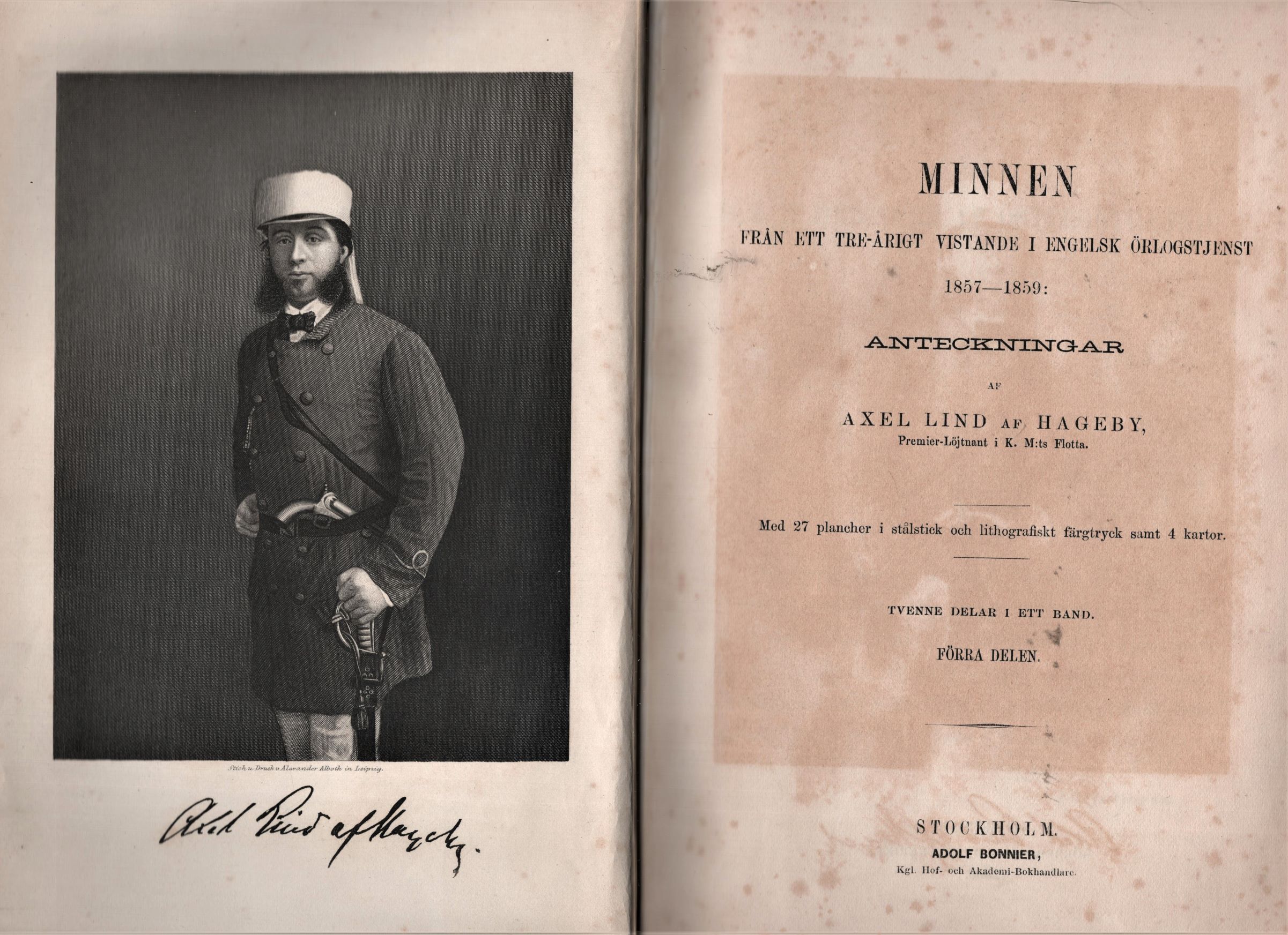 Minnen från ett tre-årigt vistande i engelsk örlogstjenst 1857-1859: Anteckningar. Med 27 planscher i stålstick och lithografiskt färgtryck samt 4 kartor. Tvenne delar i ett band.