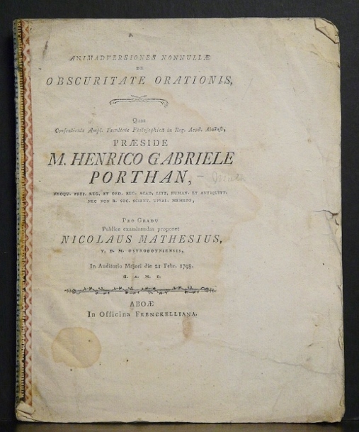 Porthan, Henric Gabriel: Animadversiones nonnullae de obscuritate orationis. Resp. Nicolaus Mathesius – väitöskirjat