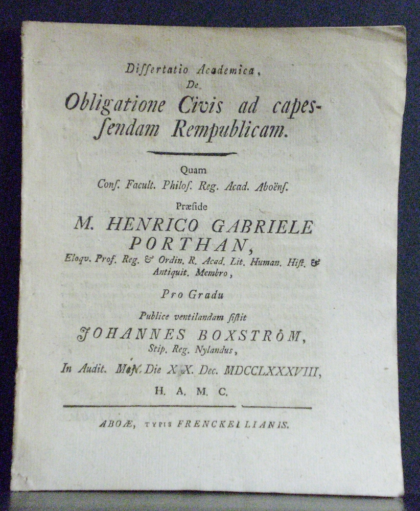 Porthan, Henric Gabriel: De obligatione civis ad capessendam rempublicam. Resp. Johannes Boxström – väitöskirjat