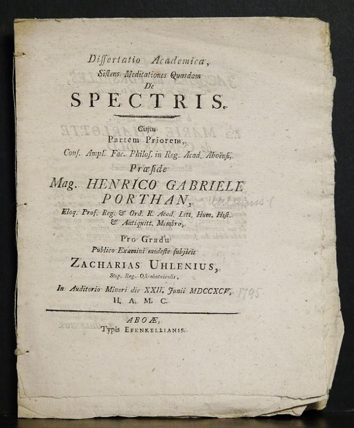 Porthan, Henric Gabriel: Dissertatio academica, sistens medictationes quasdam de spectris. Partem priorem. Resp. Zacharias Uhlenius. – väitöskirjat