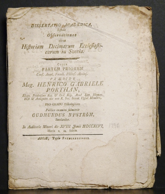 Porthan, Henric Gabriel: Dissertatio academica, sistens observationes circa historiam decimarum ecclesiasticarum in Svecia. Partem priorem. Resp. Gudmundus Nyström – väitöskirjat