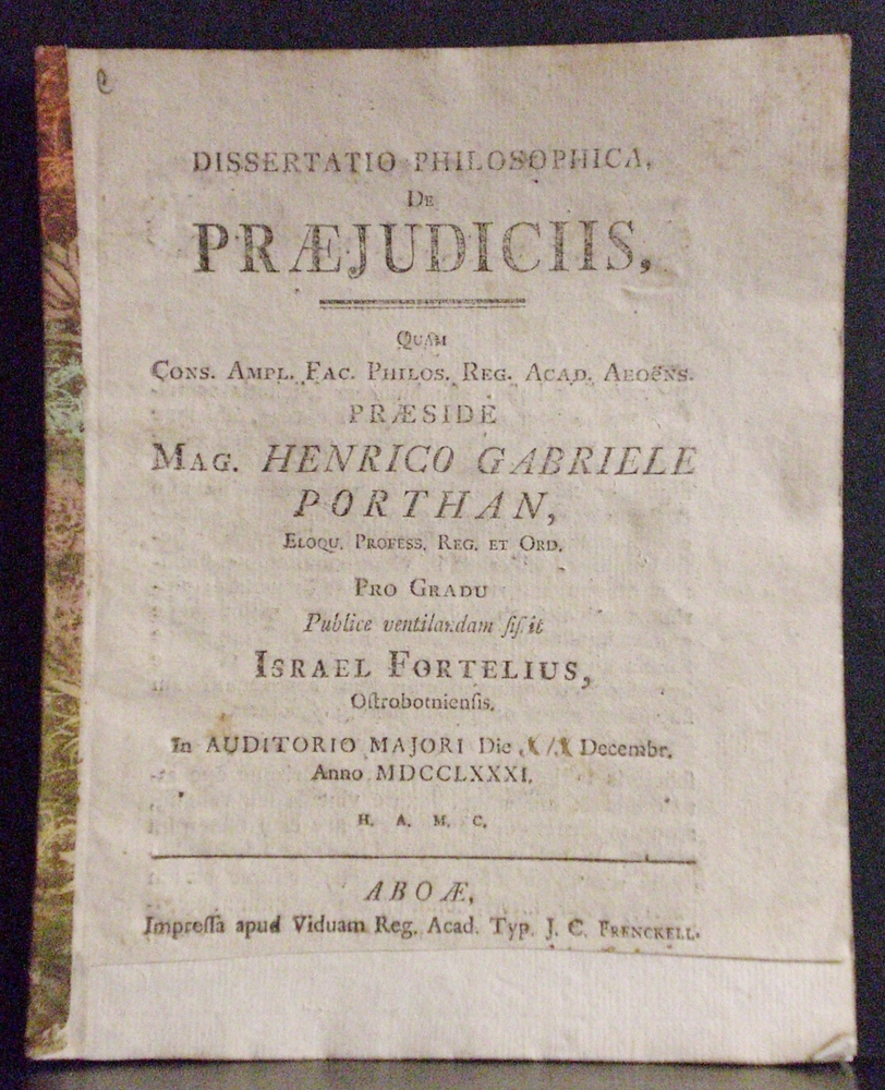 Porthan, Henric Gabriel: Dissertatio philosophica, de praejudiciis. Resp. Israel Fortelius – väitöskirjat