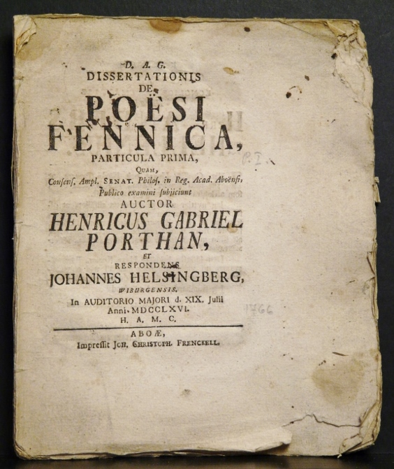 Porthan, Henric Gabriel: Dissertationis de poesi Fennica. Particula prima. Resp. Johannes Helsingberg – väitöskirjat