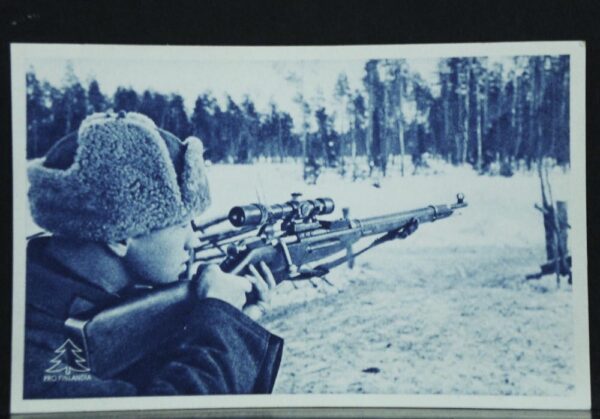 Postikortti – Postkort: Pro Finlandia. Sotilas viholliselta vallattuine kiikarikivääreineen