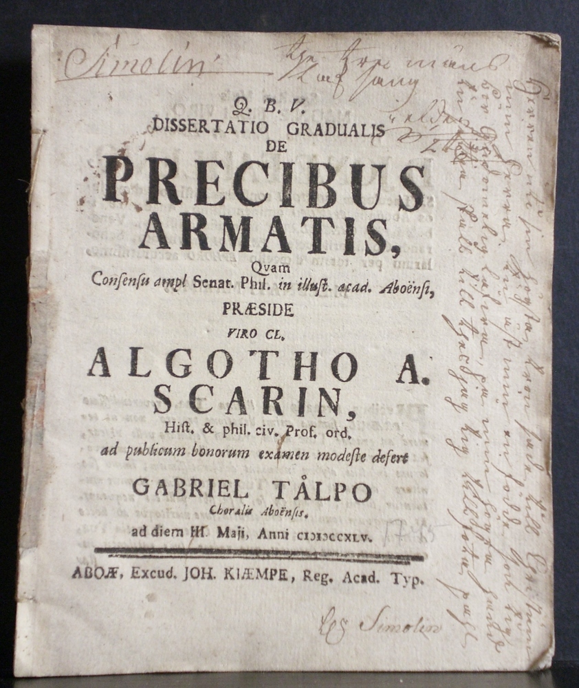 Scarin, Algothus: Dissertatio gradualis de precibus armatis. Resp. Gabriel Tålpo – väitöskirjat