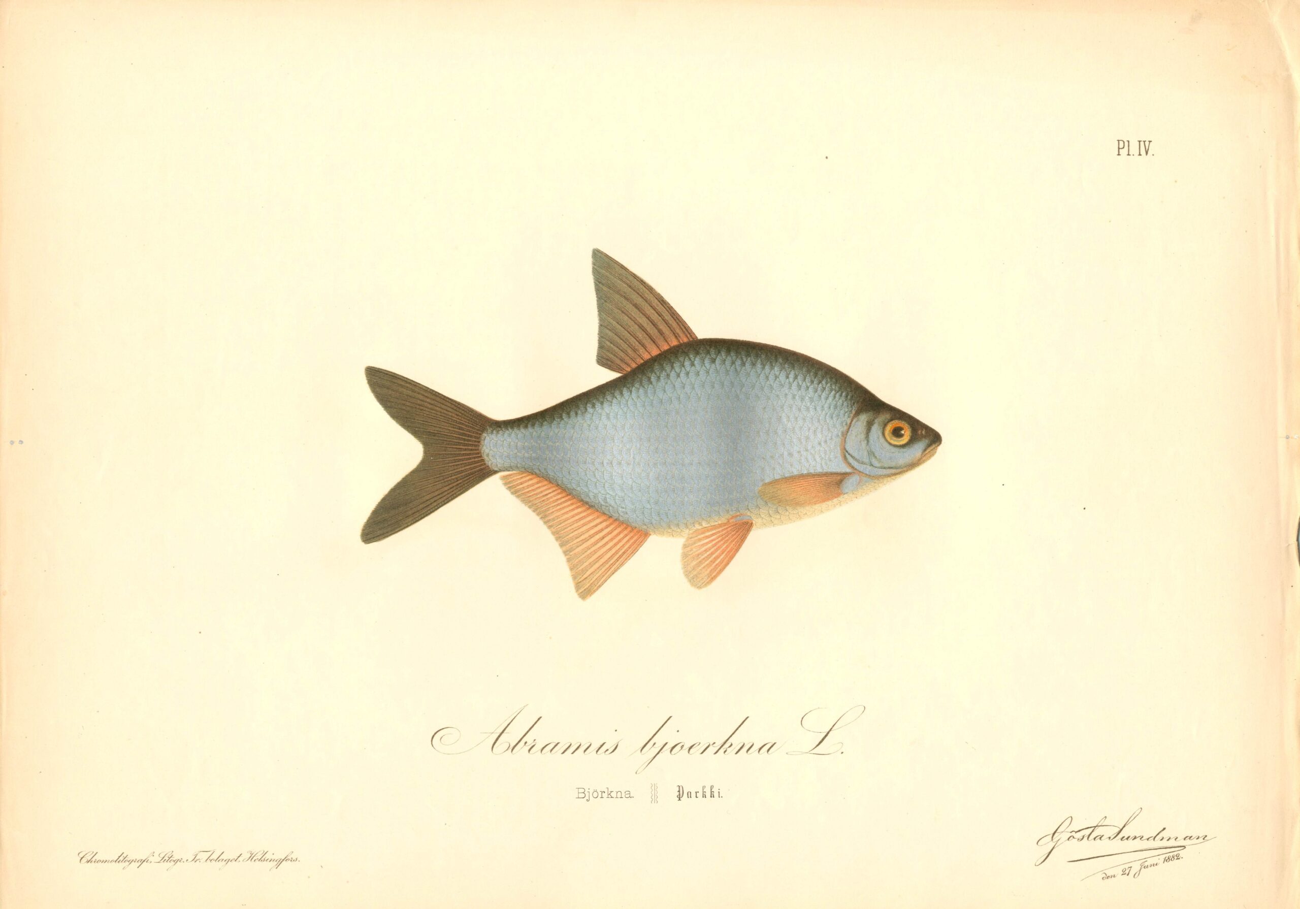 Björkna. Originalkromolitografi från Gösta Sundmans storverk Finlands fiskar (1883-1893).