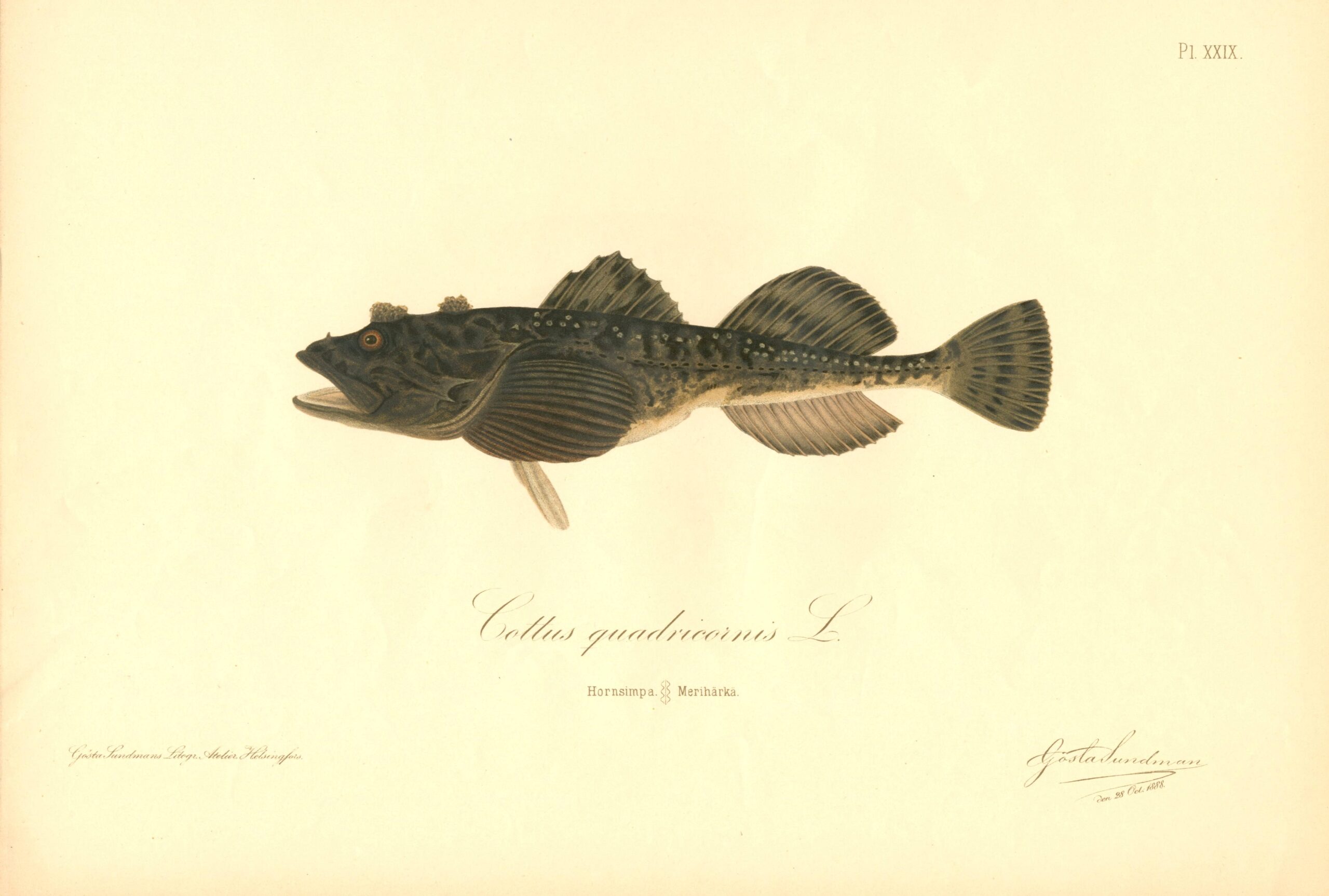 Original 19th-Century Fish print of the Fourhorn sculpin – From The Fishes of Finland