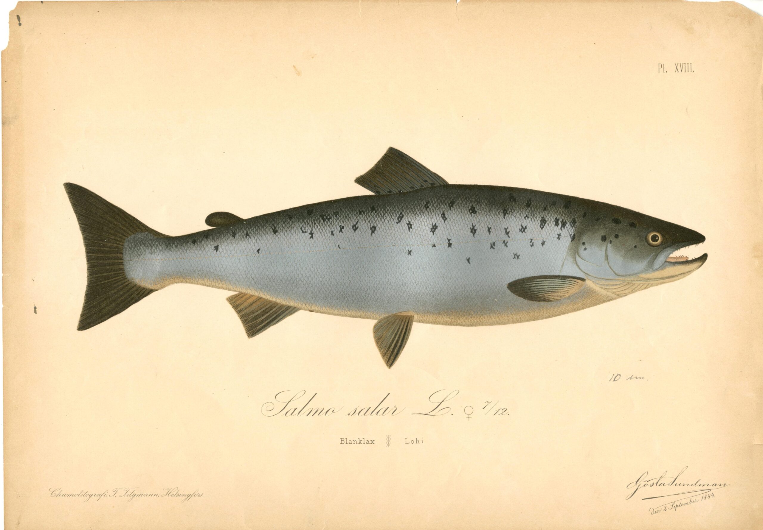 Atlantlax, blanklax. Originalkromolitografi från Gösta Sundmans storverk Finlands fiskar (1883-1893).
