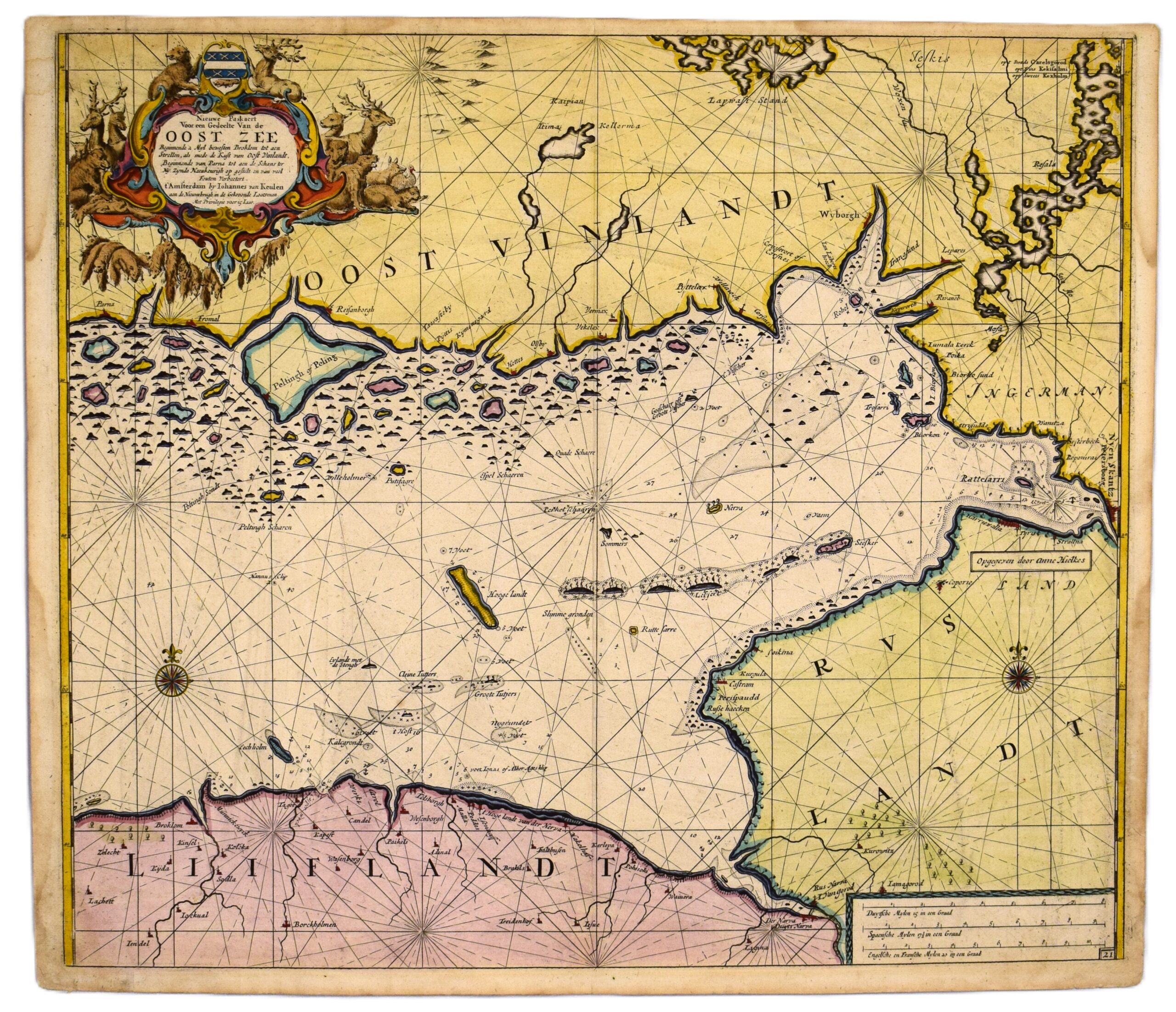 An original 17th-century sea chart of the Gulf of Finland by Dutch mapmaker Johannes van Keulen. This copperplate engraving features beautiful, old hand-colouring. The map depicts the eastern part of the Gulf of Finland; on the Finnish side, the Pellinki Island on the left and Viborg on the right, along with the Nyenschantz fortress – located where St. Petersburg stands today. On the Estonian coastline Wesenberg (Rakvere) can be located in the center, near Island Ekholm (Mohni).