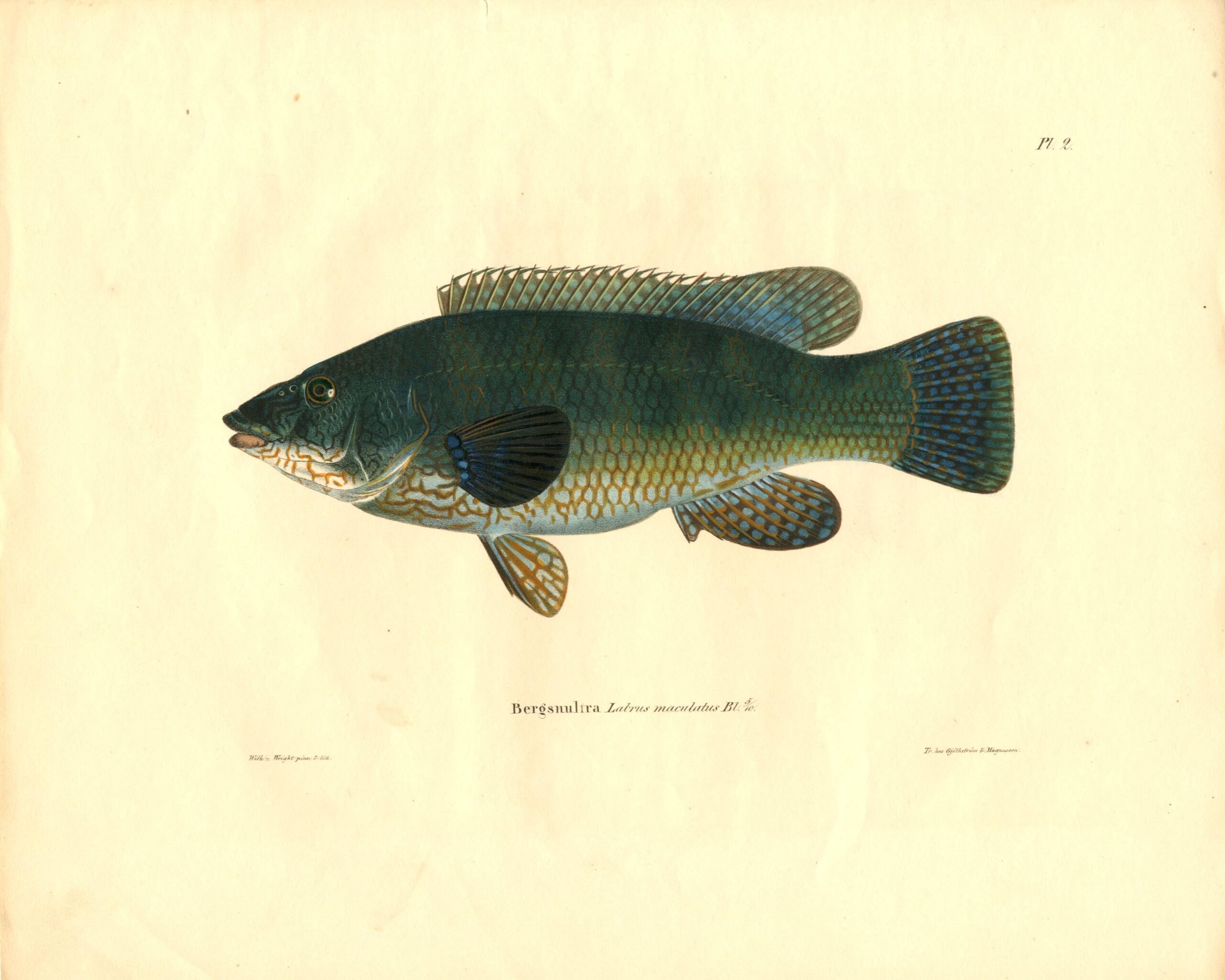 Original 19th-century Fish print of a Ballan wrasse by Wilhelm von Wright.