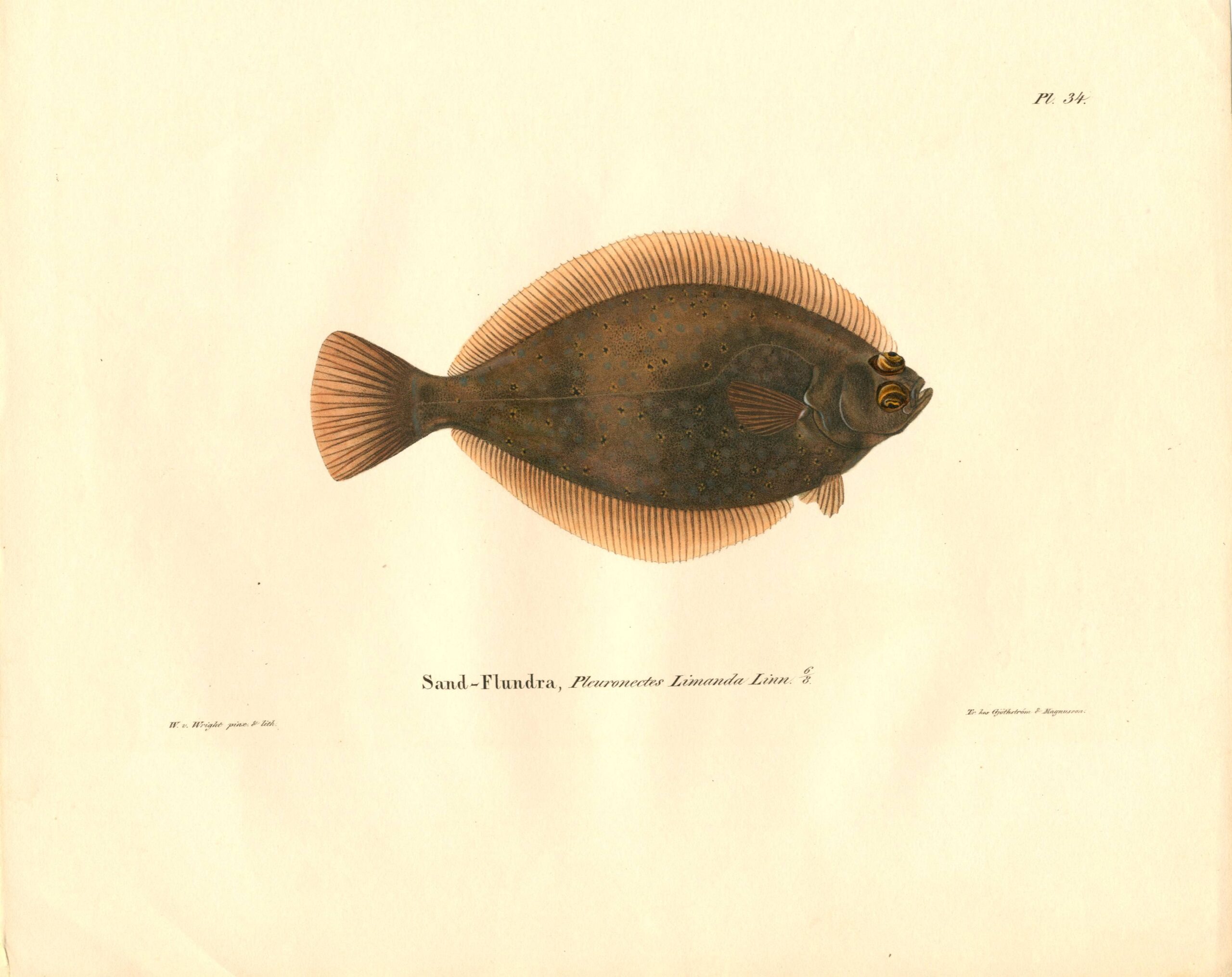 VON WRIGHT: Fish Lithograph – Pleuronectes Limanda Linn. (Hietakampela – Sandflundra)