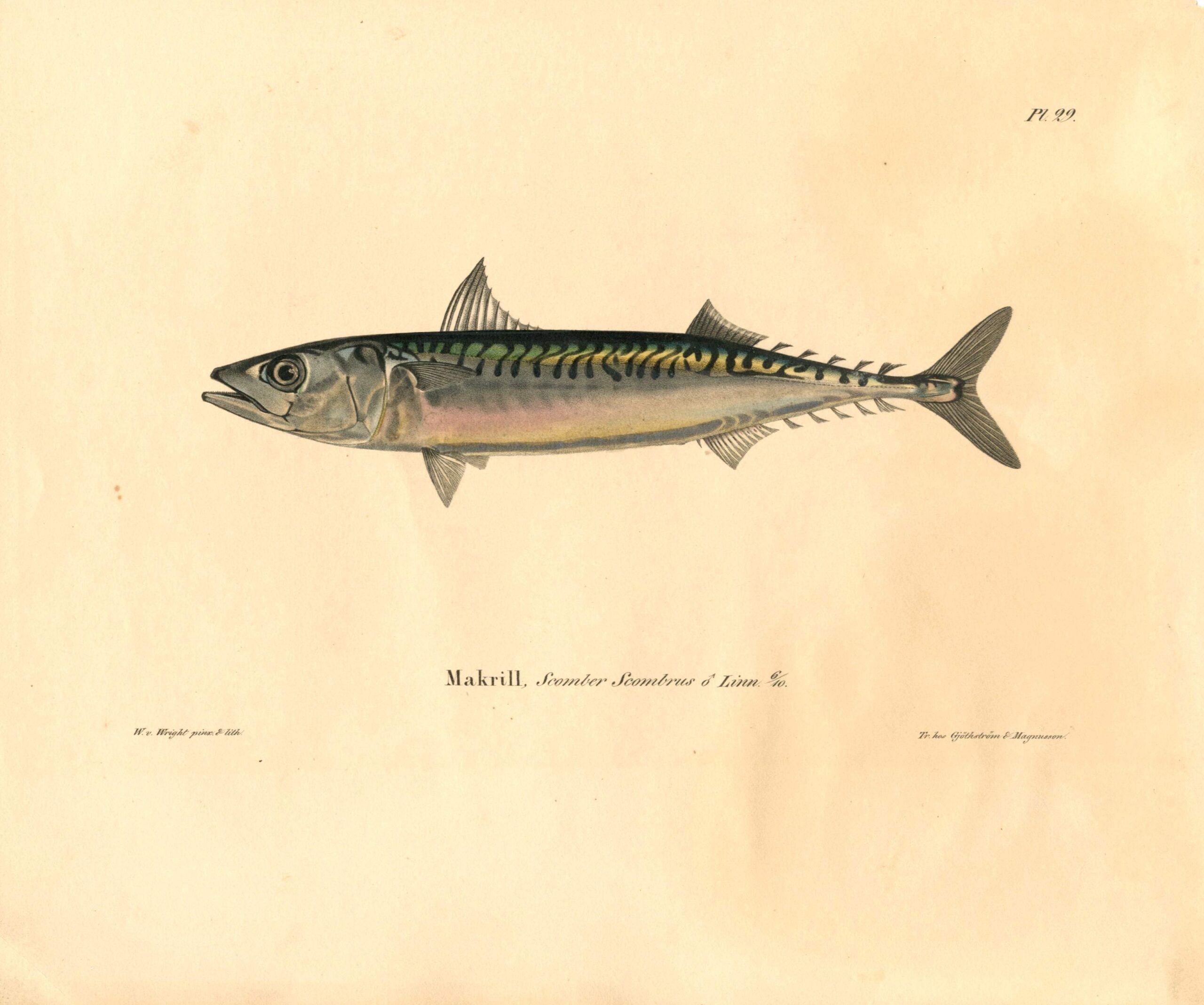 Makrilli. Harvinainen Wilhelm von Wrightin käsinväritetty kalalitografia 1830-luvulta. Tämä kivipiirros on kuulunut Wilhelm von Wrightin Skandinaviens fiskar (‘Pohjolan kalat’) teoksen ensimmäiseen painokseen, joka julkaistiin vihkopainoksena Tukholmassa vuosien 1836 ja 1857 välillä. Painoksen koko oli vain 500 kappaletta, joista 300:ssa oli värilliset kuvitukset.